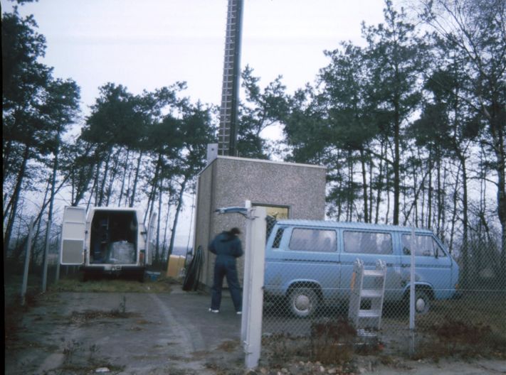Vorbereitungen zur Installation der Antenne. Ein ganz Mutiger ist später bis zur Mastspitze gestiegen und hat die Antenne montiert. Die umgebauten Telefonhäuschen sind sind hinter dem Funktionsgebäude angebracht. |
