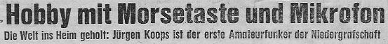 Der erste Funkamateur der Niedergrafschaft war Jürgen Koops (DJ5KE) aus Hardingen. Er erhielt seine Lizenz im März 1967 (Hier zum Zeitungsartikel). Bald darauf folgte ihm Albert Holthuis (DK3BC) aus Hardingen.