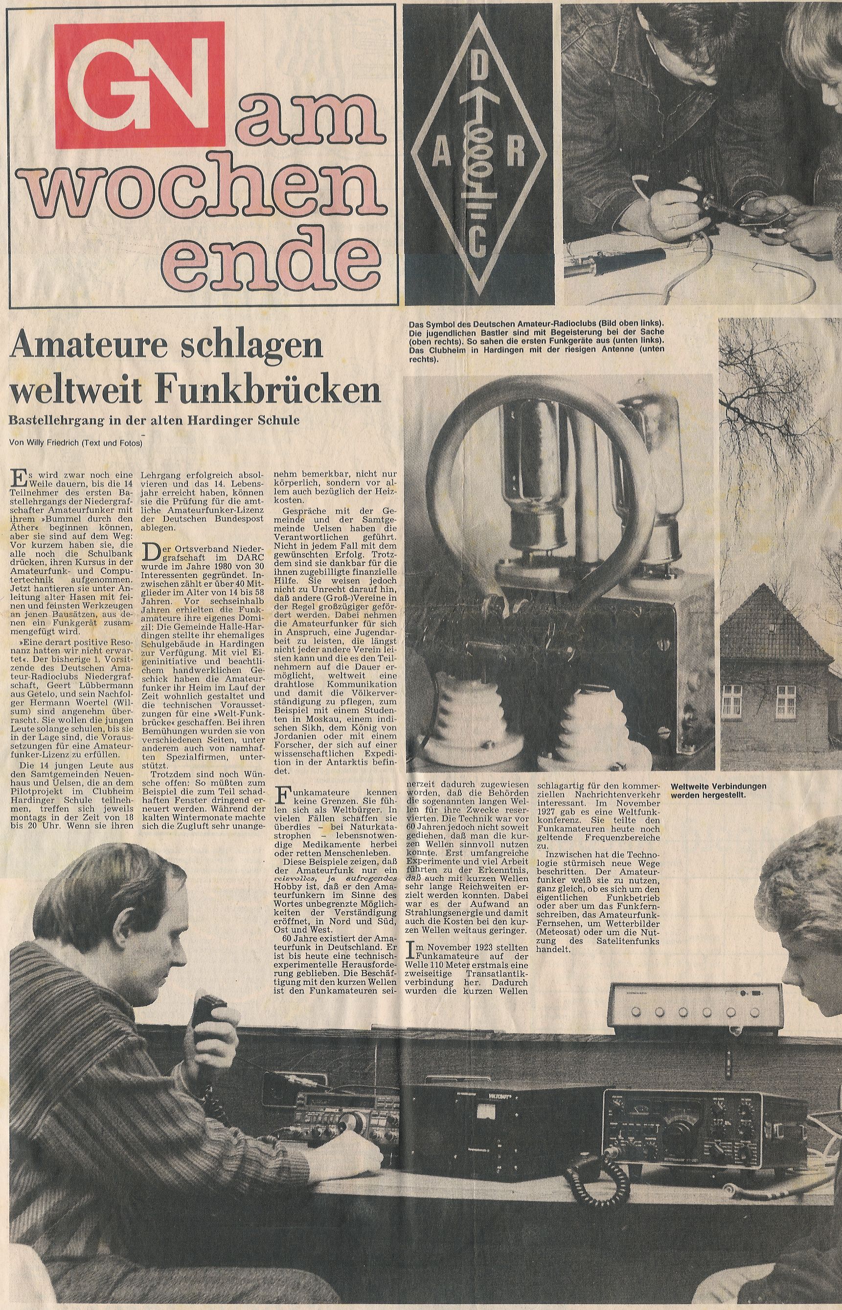 Der Ortsverband Niedergrafschaft im DARC wurde im Jahre 1980 von 30 Interessenten gegründet. Inzwischen zählt er über 40 Mitglieder im Alter von 14 bis 58 Jahren. Vor sechseinhalb Jahren erhielten die Funkamateure ihr eigenes Domizil: Die Gemeinde Halle-Hardingen stellte ihr ehemaliges Schulgebäude in Hardingen zur Verfügung. Mit viel Eigeninitiative und beachtlichem handwerklichen Geschick haben die Amateurfunker ihr Heim im Lauf der Zeit wohnlich gestaltet und die technischen Voraussetzungen für eine »Welt-Funkbrücke« geschaffen.
