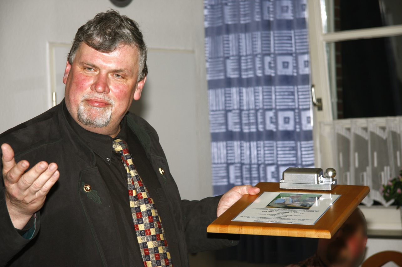 Hans-Jürgen stellt die silberne Morsetaste vor und ernennt Albert Holthuis zum "Homo orientalis honoris causa" (Ehren-Ossi). |