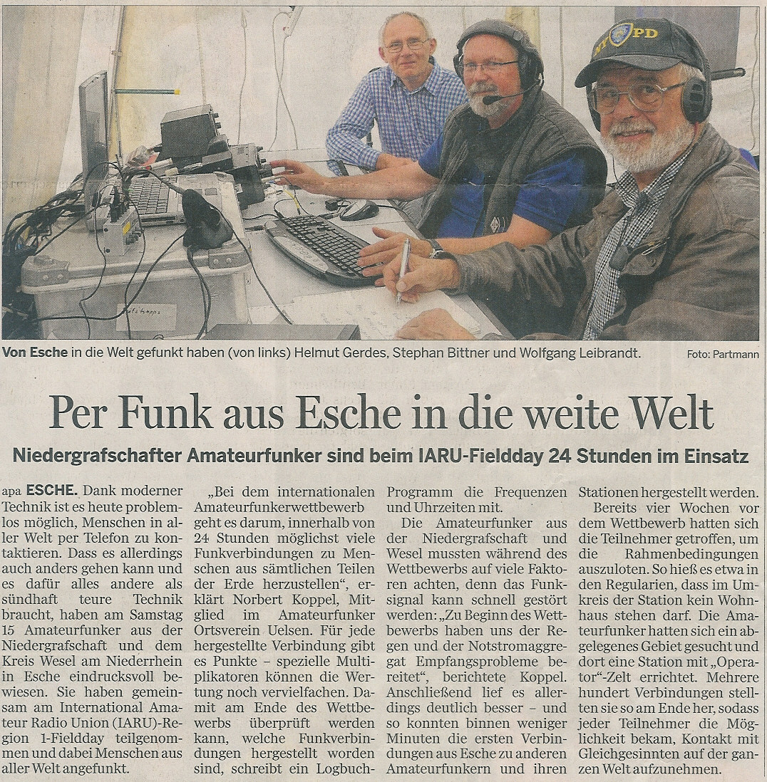 Esche. Dank moderner Technik ist es heute problemlos möglich, Menschen in aller Welt per Telefon zu kontaktieren. Dass es allerdings auch anders gehen kann und es dafür alles andere als sündhaft teure Technik braucht, haben am Samstag 15 Amateurfunker aus der Niedergrafschaft und dem Kreis Wesel am Niederrhein in Esche eindrucksvoll bewiesen. Sie haben gemeinsam am International Amateur Radio Union (IARU)-Region 1-Fieldday teilgenommen und dabei Menschen aus aller Welt angefunkt.