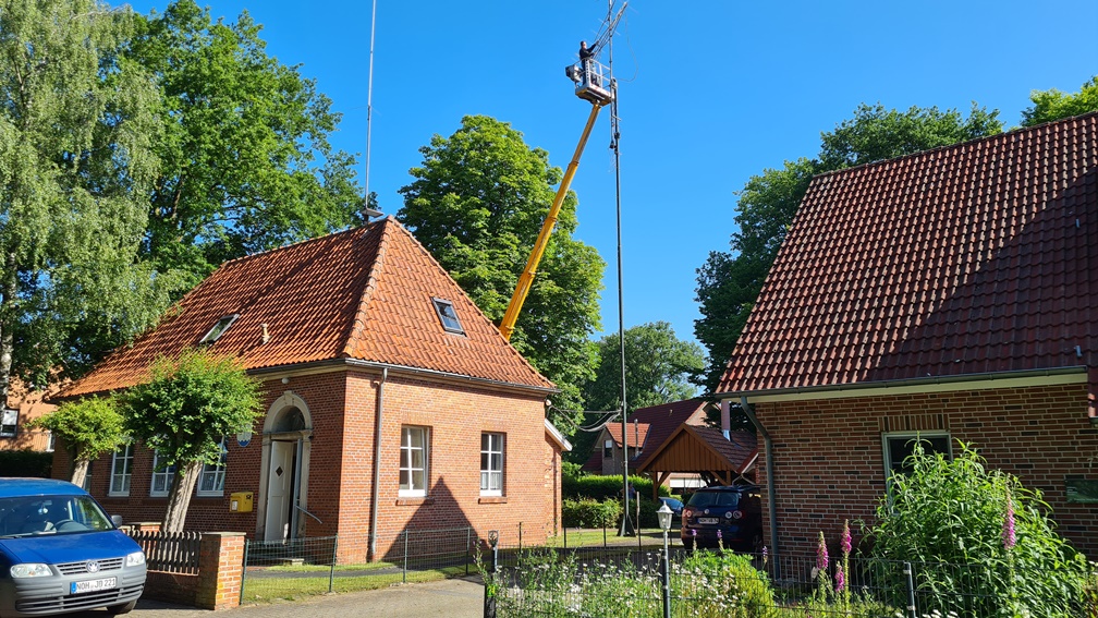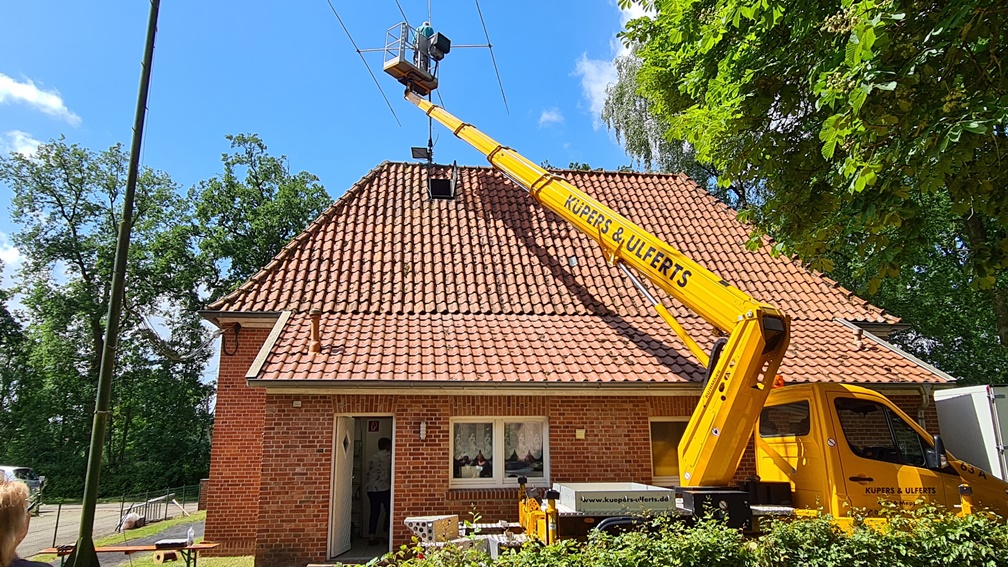 Im Rahmen einer gemeinschaftlichen Aufräum- und Pflegeaktion der Gemeinde Halle/Hardingen rund um das alte Schulgebäude traten am vergangenen Samstag (11. Juni 2022) auch die Funkamateure an, um die teils sturmgeschädigten Antennen durch neue zu ersetzen. Mit Hilfe einer Hubarbeitsbühne wurden sowohl auf dem Mast, als auch auf dem Dach neue Antennen für Kurzwelle und Ultrakurzwelle gesetzt, sowie Langdrahtantennen gezogen. Nun ist die Funkstation wieder voll einsatzfähig. Gerade in der aktuell angespannten Zeit gibt es den Funkamateuren ein sicheres Gefühl, sich in der Kommunikation nicht nur auf das klassische Fernmeldenetz oder Internet verlassen zu müssen.