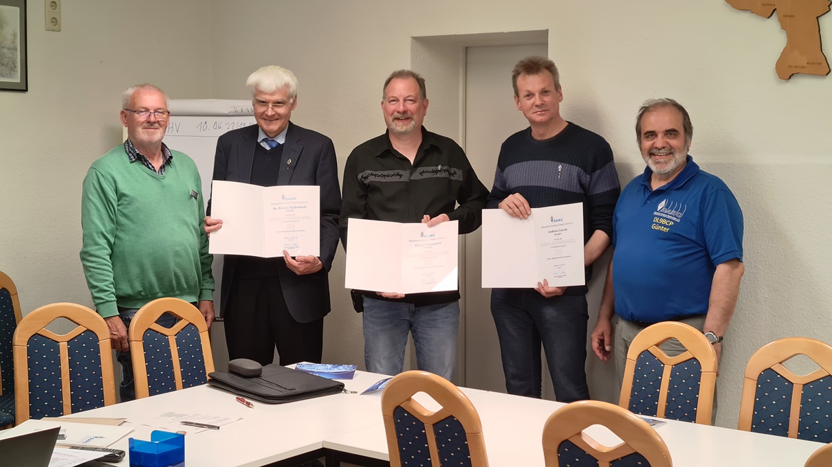 Am 10. Juni 2022 fand in der alten Schule Hardingen die Jahreshauptversammlung des Ortsverbandes „Niedergrafschaft“ des Deutschen Amateur Radio Clubs (DARC) statt. Nachdem die Hauptversammlung coronabedingt zweimal ausfiel, trafen sich Funker und Gäste nun endlich nicht nur zur Vorstandswahl, sondern auch zur mehrfach aufgeschobenen Ehrung langjähriger Mitglieder. Dazu ist auch der Vorsitzende des DARC-Distriktes „Nordsee“ aus Bremen, Günter Erdmann, angereist. Er und der Vorsitzende des hiesigen Ortsverbandes, Geert Lübbermann, ehrten drei Mitglieder: Werner Hallenbach für 50 Jahre, Holger Hansmann für 25 Jahre und Andreas Geerds für 25 Jahre Mitgliedschaft im DARC. Im Anschluss an die Ehrung erinnerte Geert Lübbermann an die letzten zwei Jahre des Ortsverbandes, dem aktuell 31 Mitglieder angehören. Lübbermann erinnerte an die Teilnahme an den Ferienpassaktionen der Gemeinde Uelsen, an die herbstlichen Elektronik-Bastelkurse in der alten Schule Hardingen und informierte über die geplante Mitgliedschaft des Ortsverbandes im neuen Kreisjugendring der Grafschaft Bentheim.
